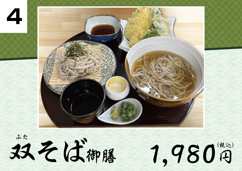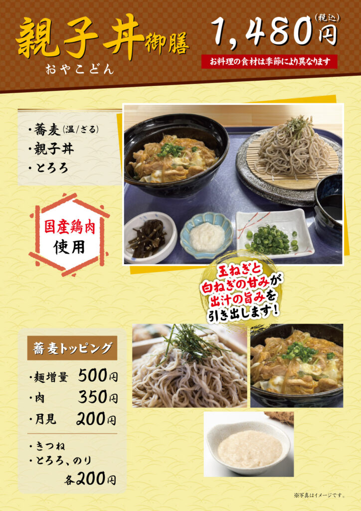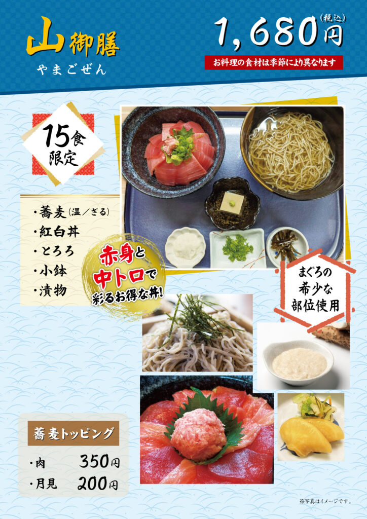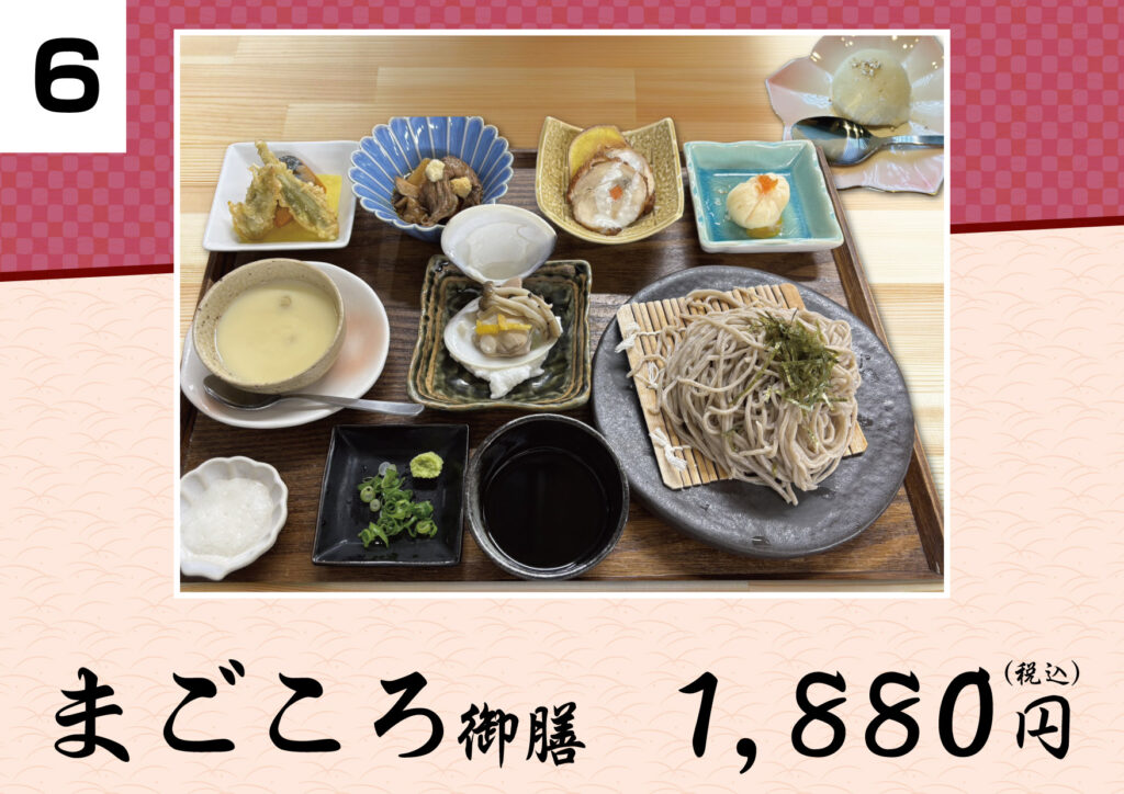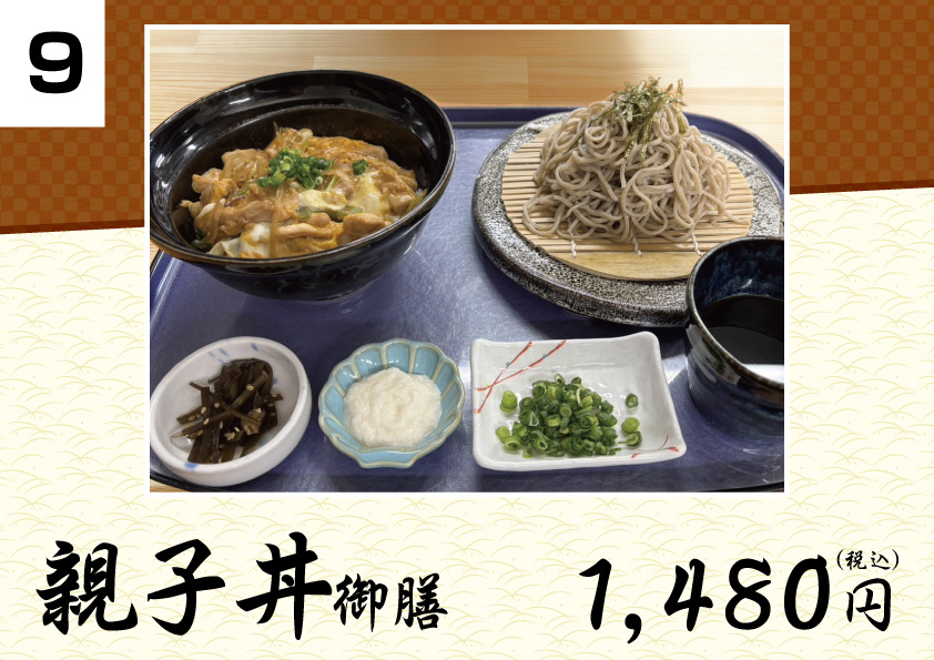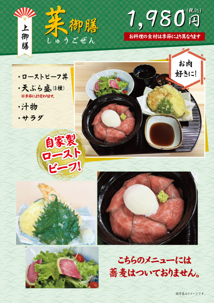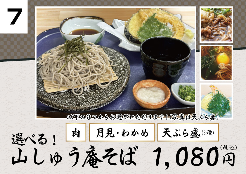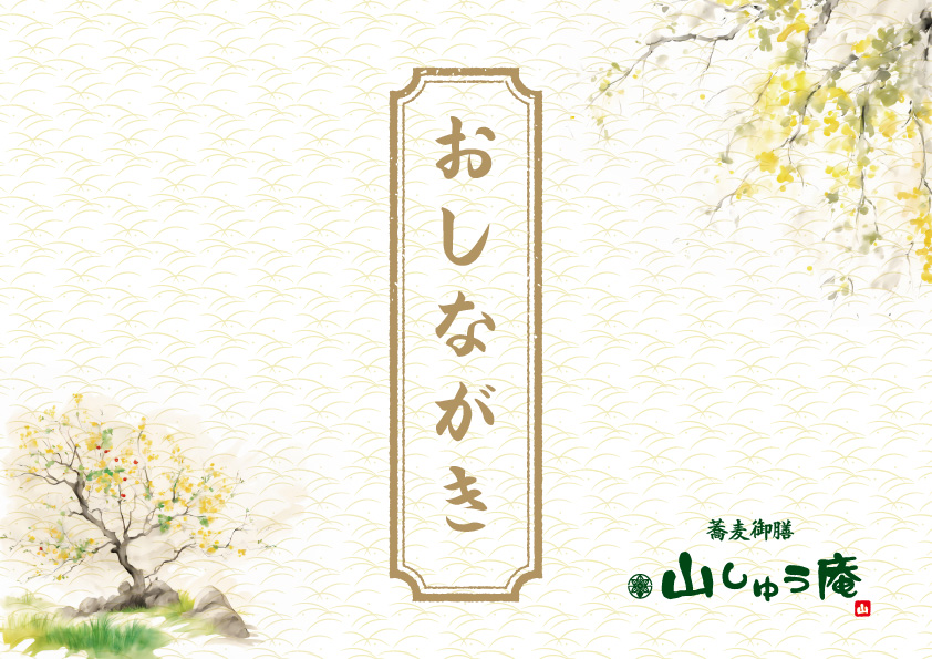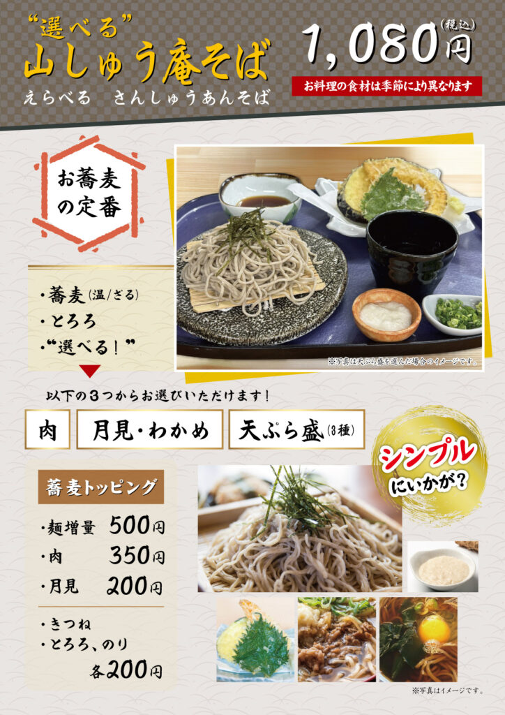 美味しい手打ち蕎麦を存分に味わっていただくために、厳選した旬の食材を使ったお料理を添えてご提供いたします。メニューは「山(やま)御膳」「茱(しゅう)御膳」「萸(ゆ)御膳」「天ぷら御膳」「まごころ御膳」「双そば御膳」「山しゅう庵そば」「特製ぶっかけ蕎麦」「親子丼御膳」の全9種です。