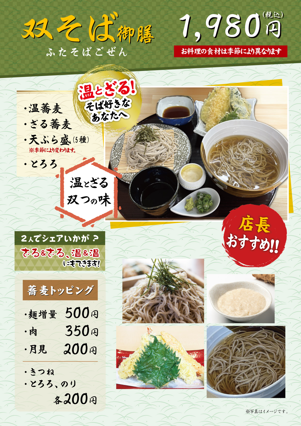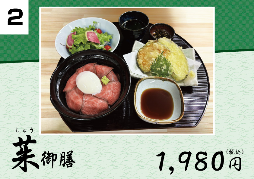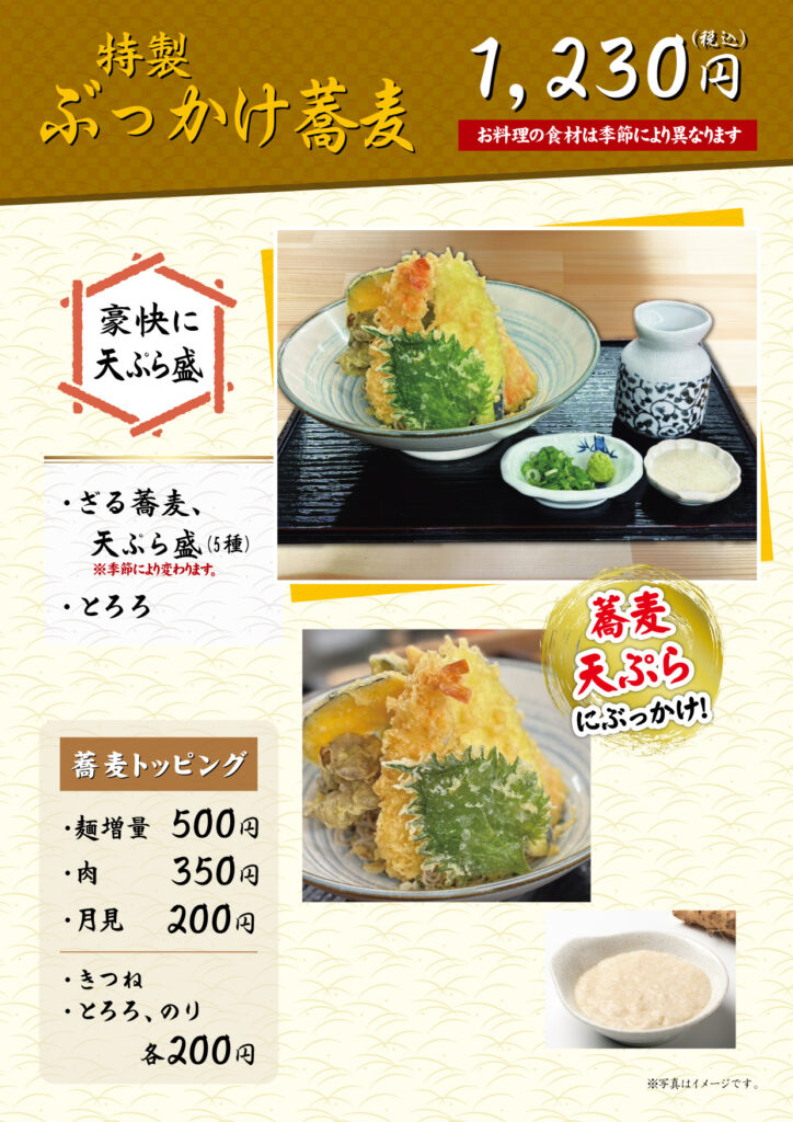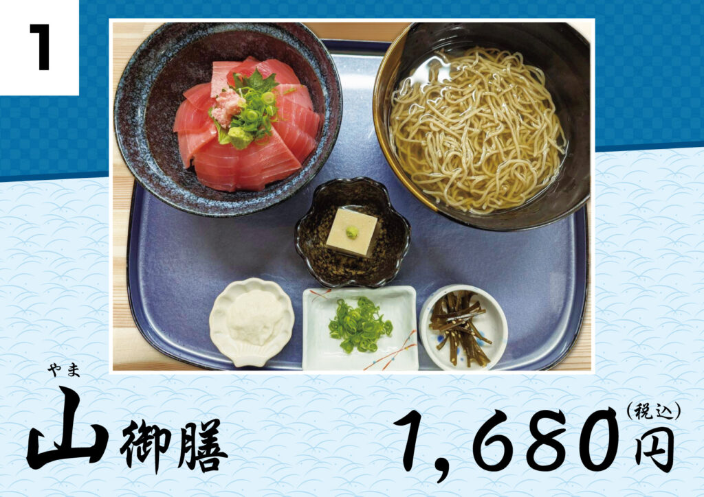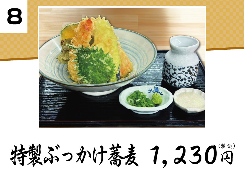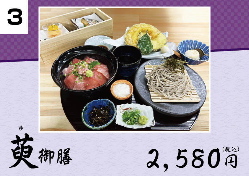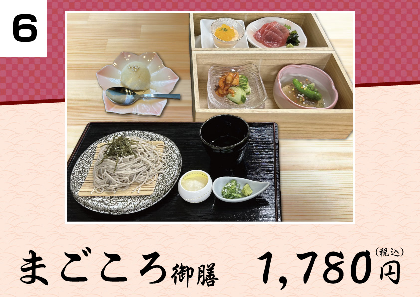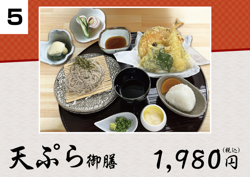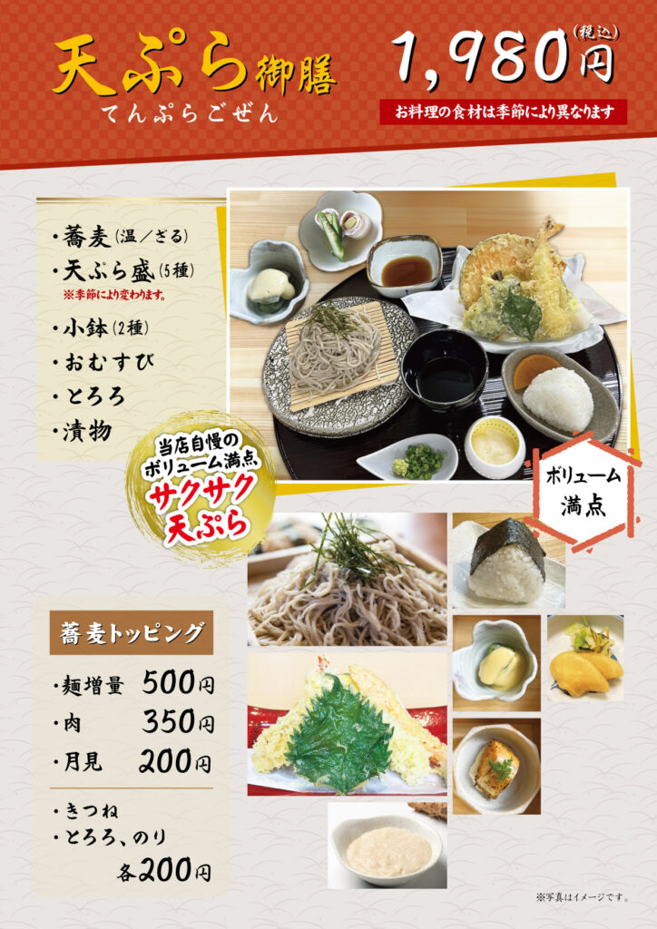 美味しい手打ち蕎麦を存分に味わっていただくために、厳選した旬の食材を使ったお料理を添えてご提供いたします。メニューは「山(やま)御膳」「茱(しゅう)御膳」「萸(ゆ)御膳」「天ぷら御膳」「まごころ御膳」「双そば御膳」「山しゅう庵そば」「特製ぶっかけ蕎麦」「親子丼御膳」の全9種です。
